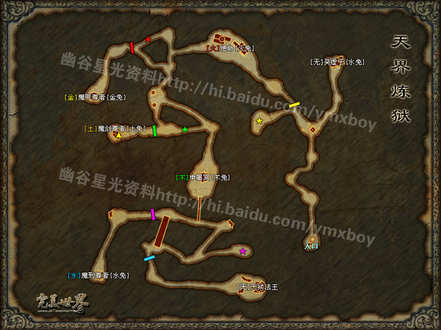 1、進入副本,首先走到★位置,殺掉魔域守衛,打開通往山指房間的紅色大門。