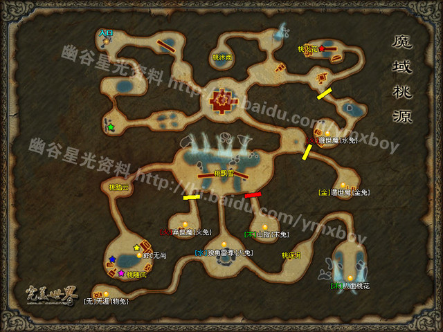 2、順路從大廳左下角路口走進大廳,從右上角路口進入桃沐雨房間殺掉桃沐雨,返回岔路,進入★位置的房間,打掉魔域塔和桃飛花。開啟通往避世魔、遁世魔、棄世魔 三魔房間的黃色大門。